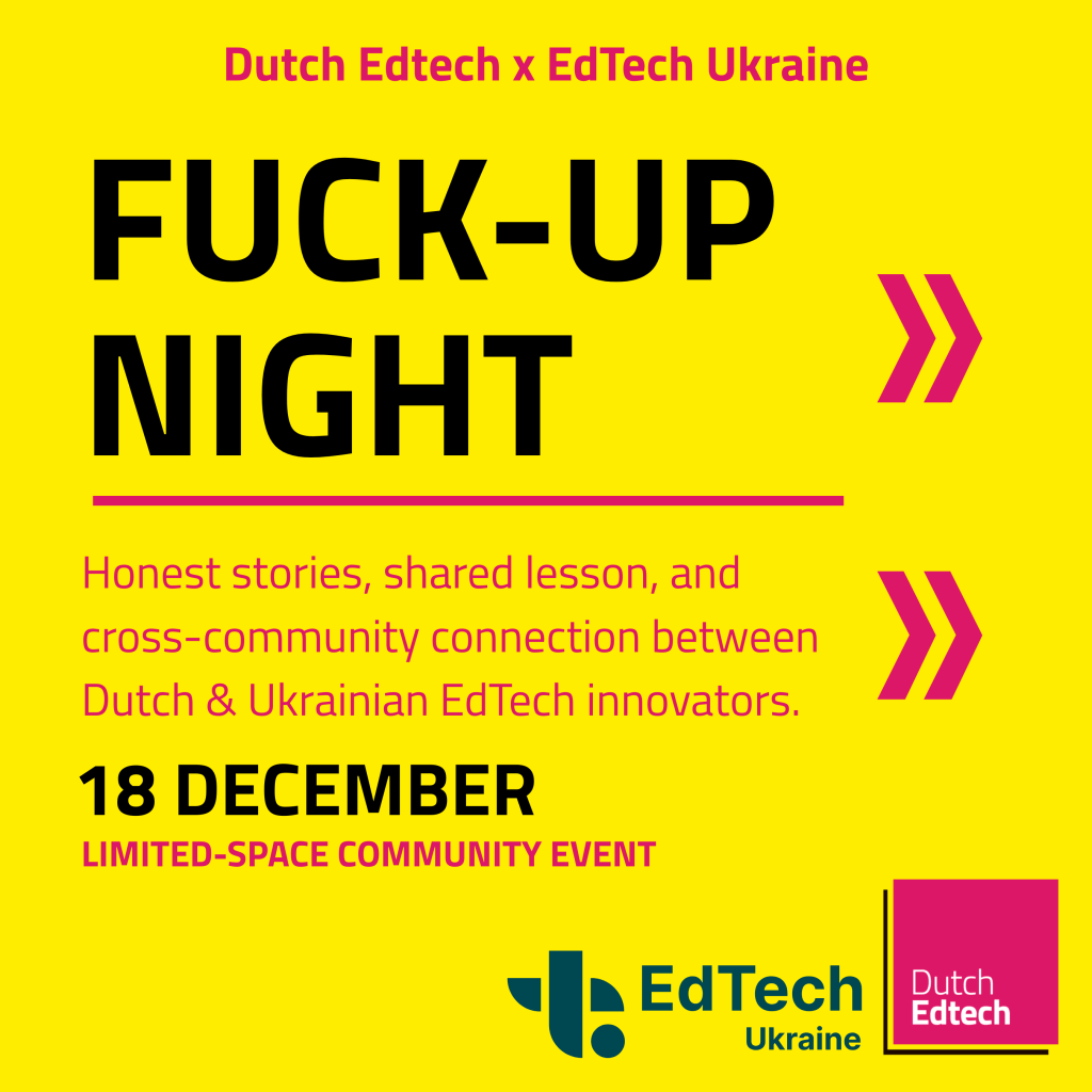 Fuck-Up Night (in the afternoon) is the first joint initiative of the newly signed collaboration between Dutch Edtech and the EdTech Ukraine Association.Together, we’re creating an open, honest, and community-driven space to share not just successes, but the failures, difficult moments, and unexpected lessons that shaped our journeys.